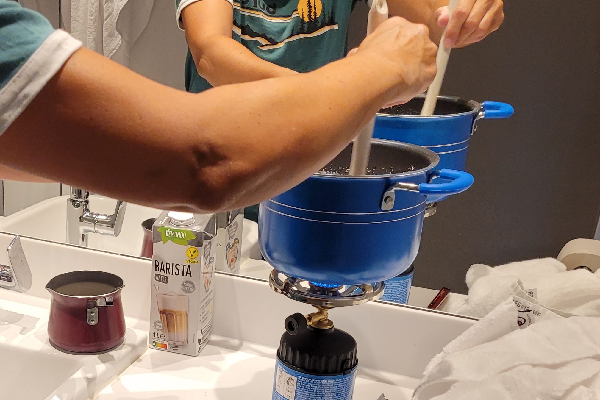 Porridge kochen im Badezimmer.