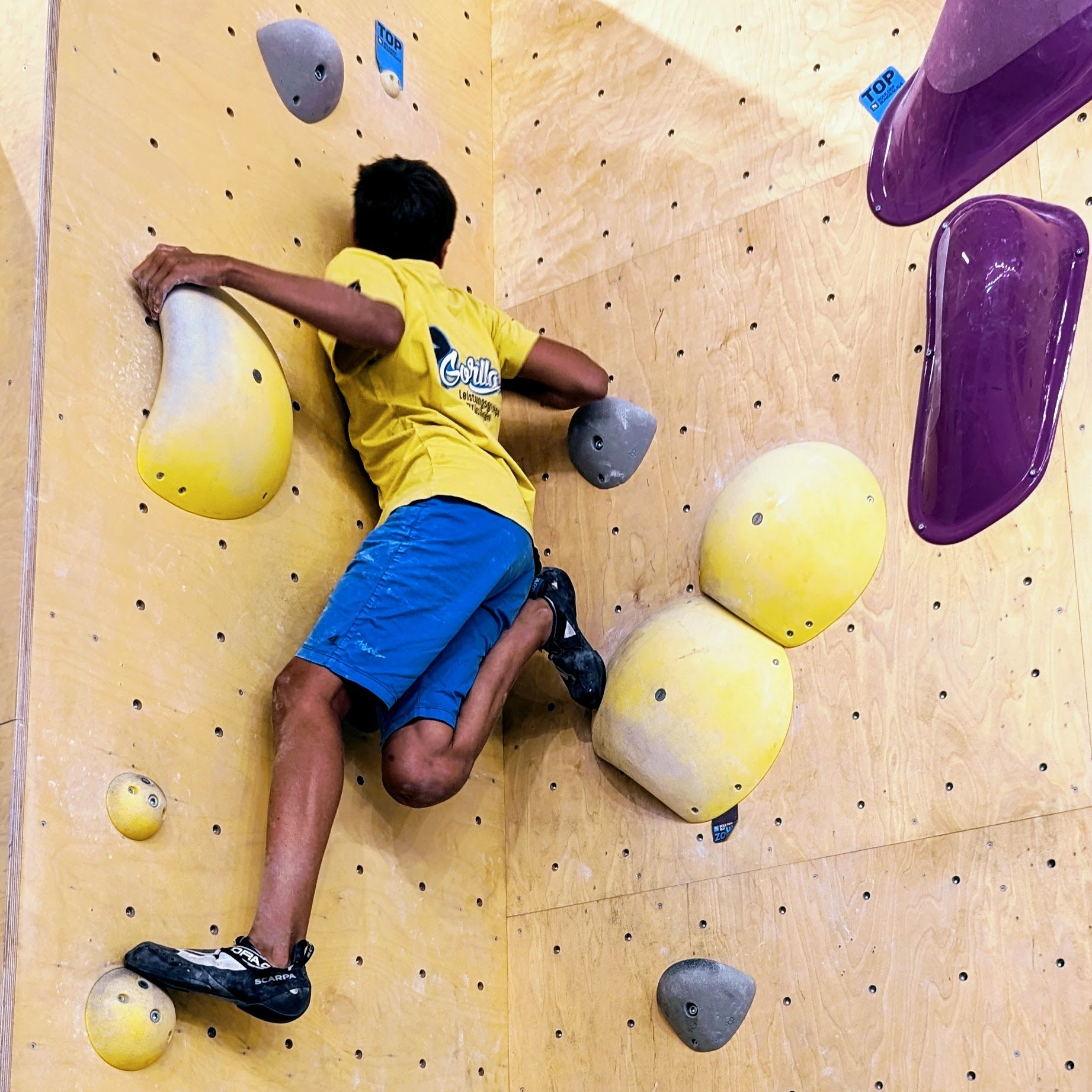 Nach einer kleinen Stärkung verschafften wir uns mit unseren Laufzetteln einen Überblick über die zahlreichen Boulderprobleme. Wir alle starteten in der 2. Liga Herren bzw. Damen. Die Schwierigkeit der Boulder reichte für uns alle von gut machbar über herausfordernd bis zu (noch) nicht machbar. Niels konnte von uns am meisten Punkte sammeln. Mats hatte viele tolle Momente in den Bouldern, aber für einige Probleme war er etwas zu kurz. Da boten ihm die Boulder der 3. Liga genügend Möglichkeiten zum Auspowern. Kate und Stephan kamen auch auf ihre Kosten.