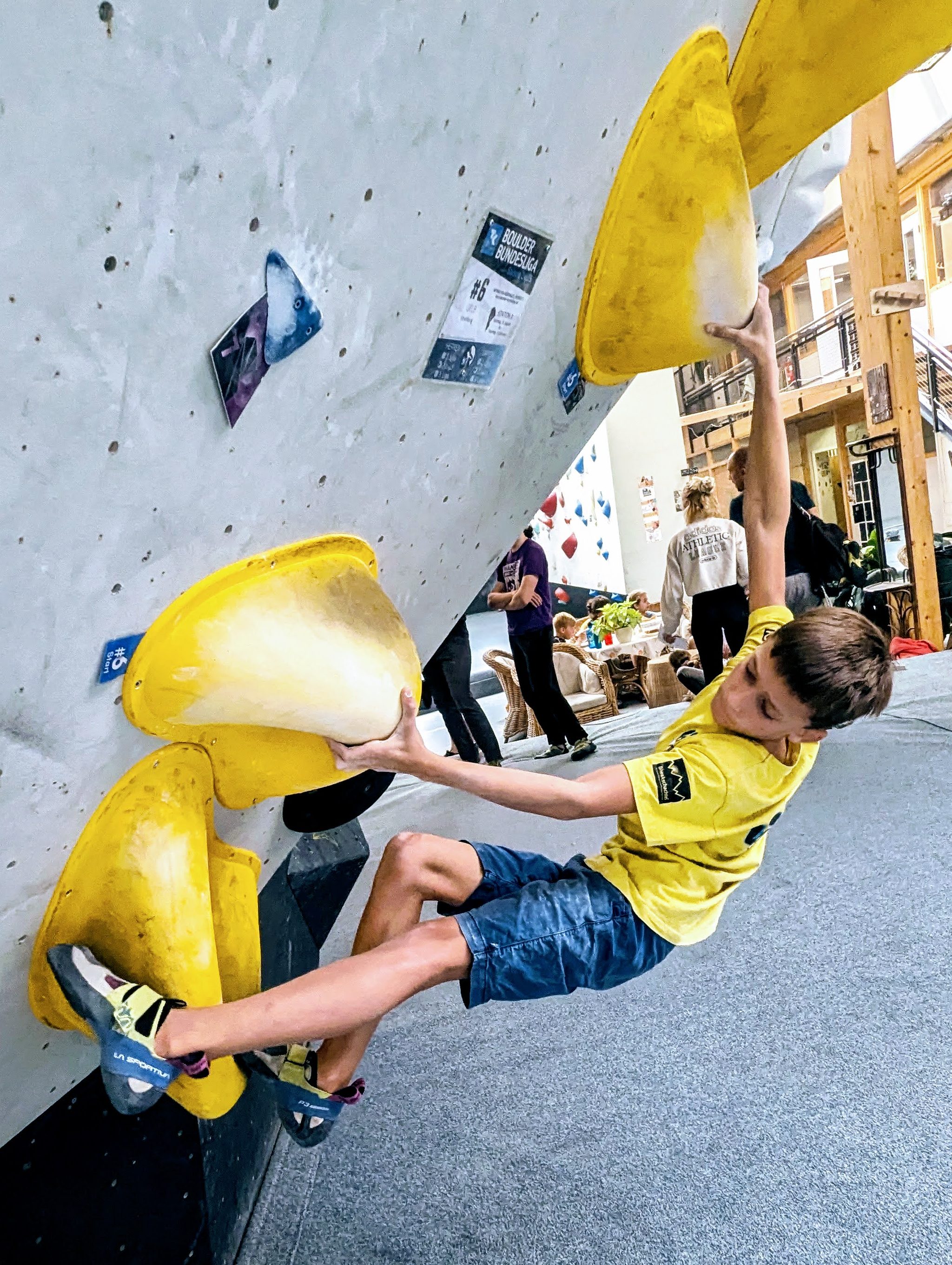 Nach unserer Ankunft und einem kleinen Mittagessen schnappten wir uns unsere Laufzettel und suchten unsere ersten Boulder. Die Jungs flitzten sofort los und holten sich die ersten Tops. Wir Eltern waren nicht ganz so flott – vielleicht steckte uns die lange Autofahrt etwas mehr in den Knochen? Ausreden halfen uns jedoch nicht weiter, also hielten wir nach Boulder Ausschau, bei denen wir unser Punktekonto füllen konnten. Regelmäßig kamen Niels und Mats bei uns vorbei und berichteten vom letzten Top oder Flash, während wir an so mancher Route scheiterten. Wir fanden die Boulderprobleme ziemlich hart geschraubt, vor allem wieder für die 2. Liga Damen – dort sind die Boulder der Herrenligen oft jenseits des Möglichen. Trotzdem gefiel uns allen auch diesmal das variantenreiche Routesetting wieder sehr gut, da sehr viele unterschiedliche Techniken mit tollen Griffen an interessanten Wänden abgefragt wurden. Niels konnte seine Scorecard erstaunlich gut füllen und auch Mats nahm einige Punkte mit und tobte sich wie immer an den Bouldern der anderen Ligen aus. Für Kate und Stephan hätte es besser laufen können – bis zur nächsten Station wird auf jeden Fall am Trainingsfleiß geschraubt. So nahmen wir alle eine tolle Bouldererfahrung mit und tankten zudem Trainingsmotivation für die nächsten Stationen.