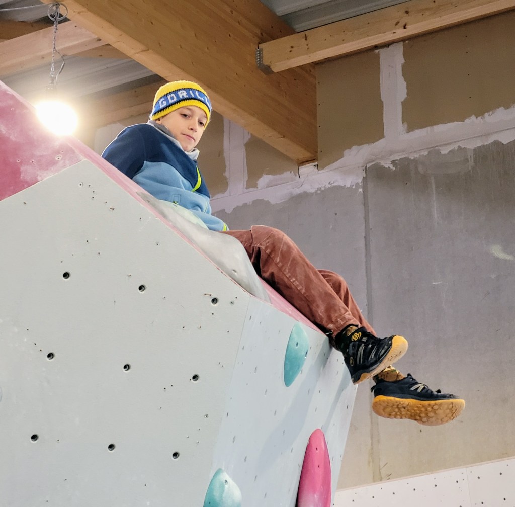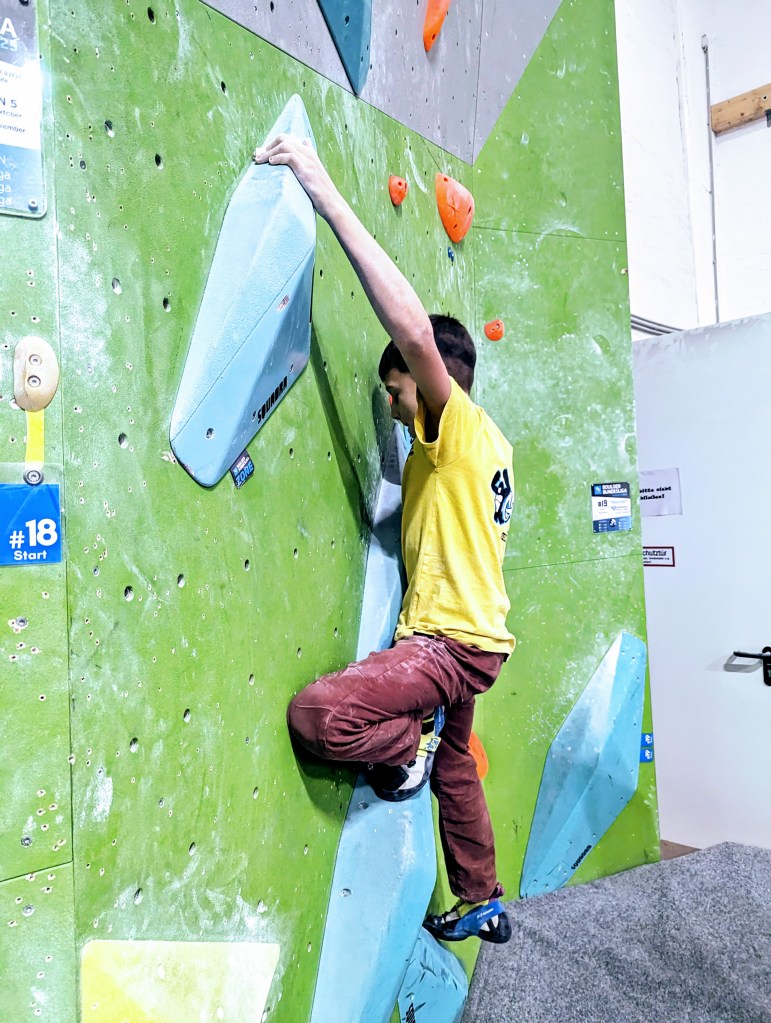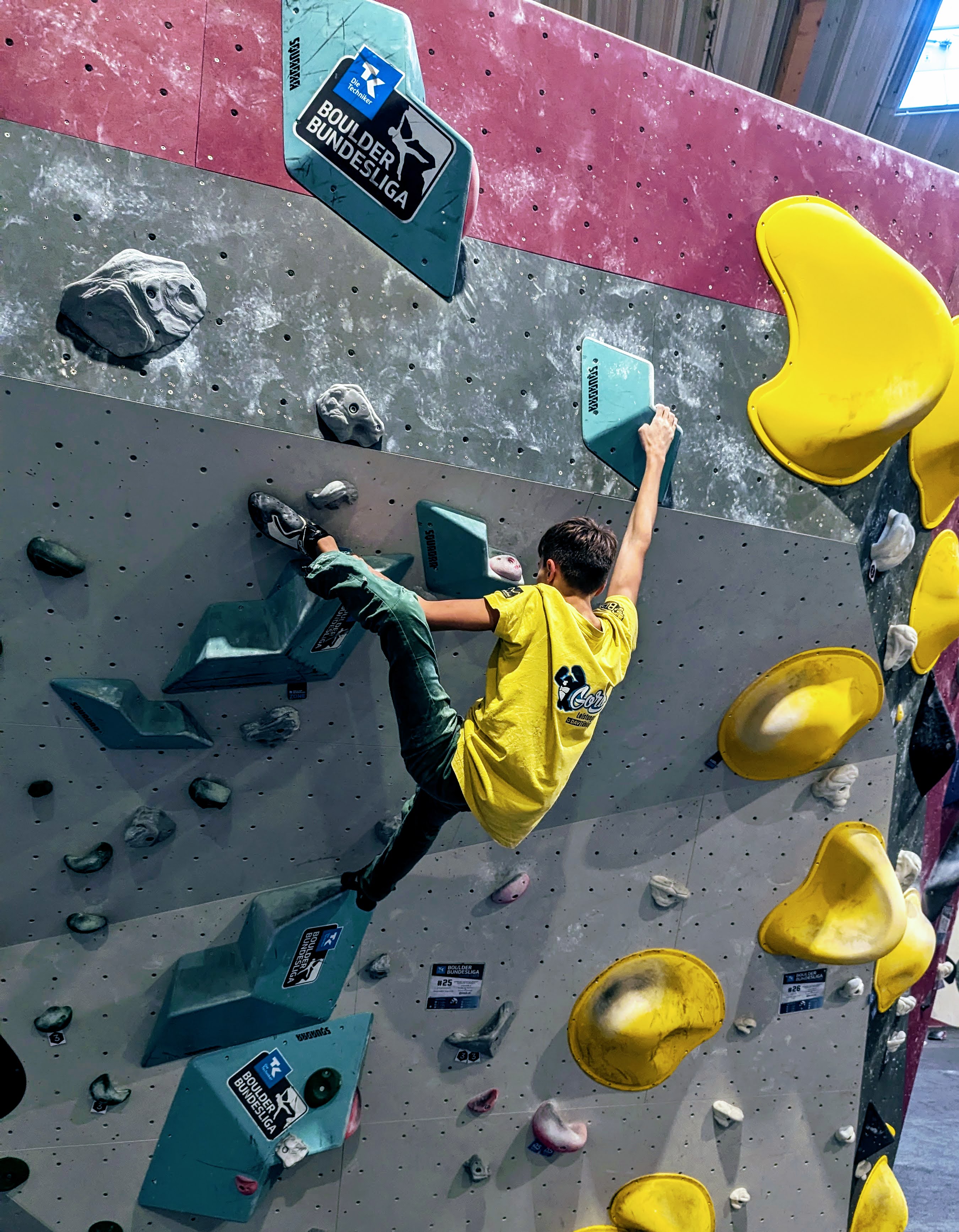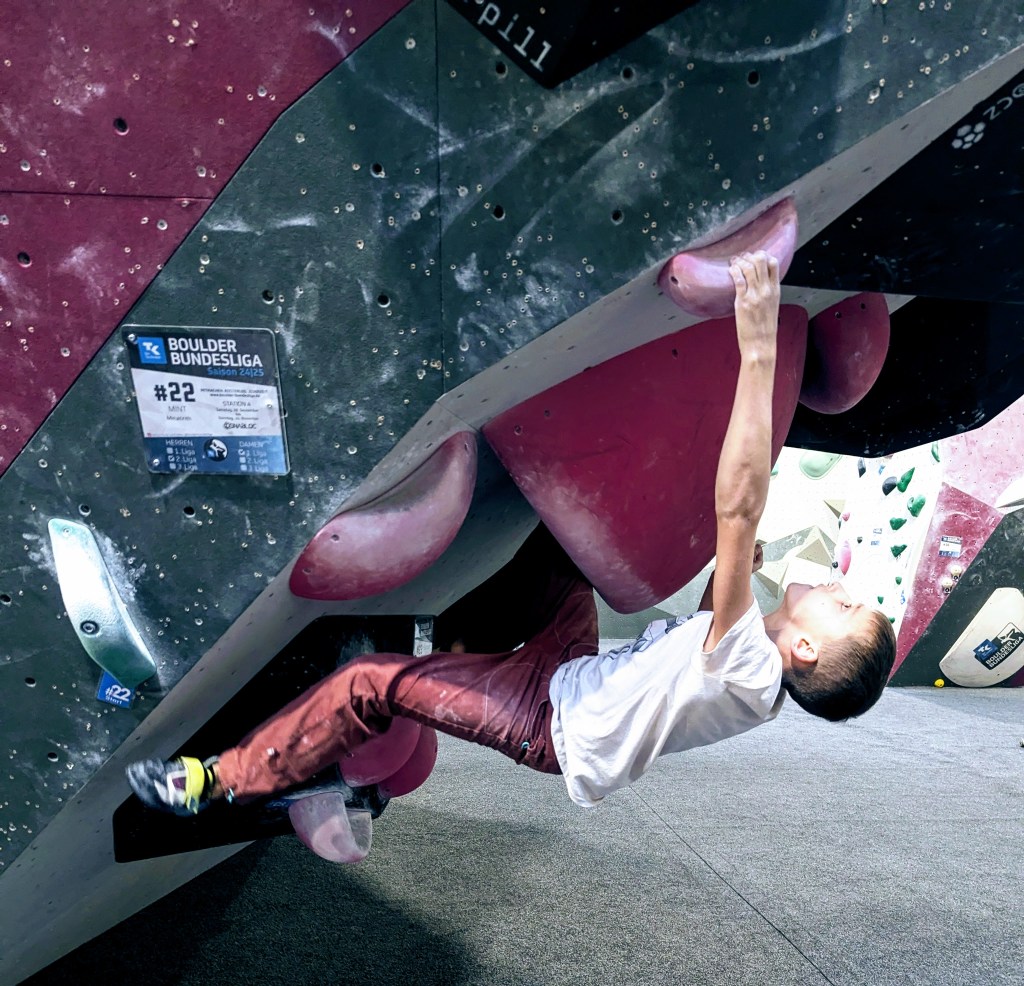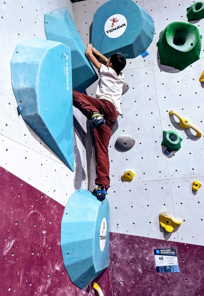 Der nächste Bouldertag hatte diesmal nichts mit der Boulder Bundesliga zu tun. Trotzdem fanden wir uns am Samstagmorgen wieder im Osnabloc ein, denn Niels nahm an der Offenen Norddeutschen Landesmeisterschaft Bouldern des DAV Nord teil (Mats war für eine Teilnahme zu jung). An der beeindruckenden Wettkampfwand des Osnablocs waren erstklassige Qualiboulder geschraubt. Die Atmosphäre beim Wettkampf war sportlich, aber angenehm; die Organisation super! Niels hatte eine gute Qualirunde, sodass er den Einzug ins Finale schaffte. Vor dem Finale ging es für die jungen Athleten sogar in die Isolationszone. Im Finale probierte Niels sich an hammerschweren Boulderproblemen. Gerne wären für ihn mehr Tops drin gewesen, aber die Stimmung in der Halle sowie die tolle Kommentation von Yannik Meyer, sorgten für sehr viel Spaß und eine tolle Wettkampferfahrung.