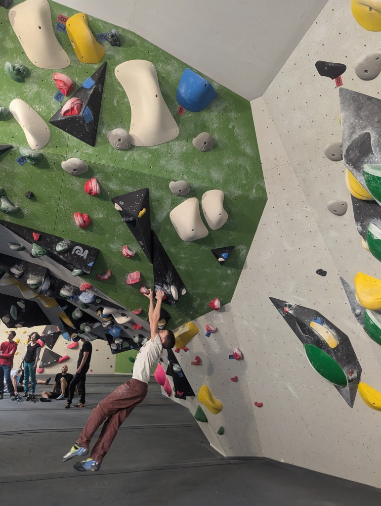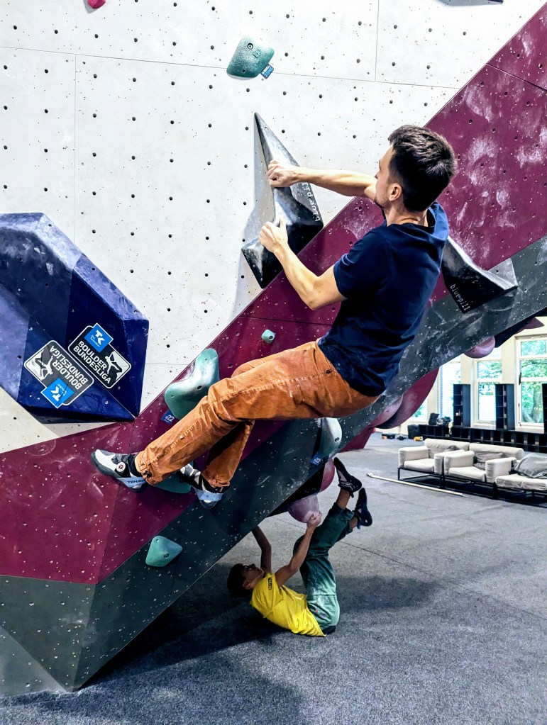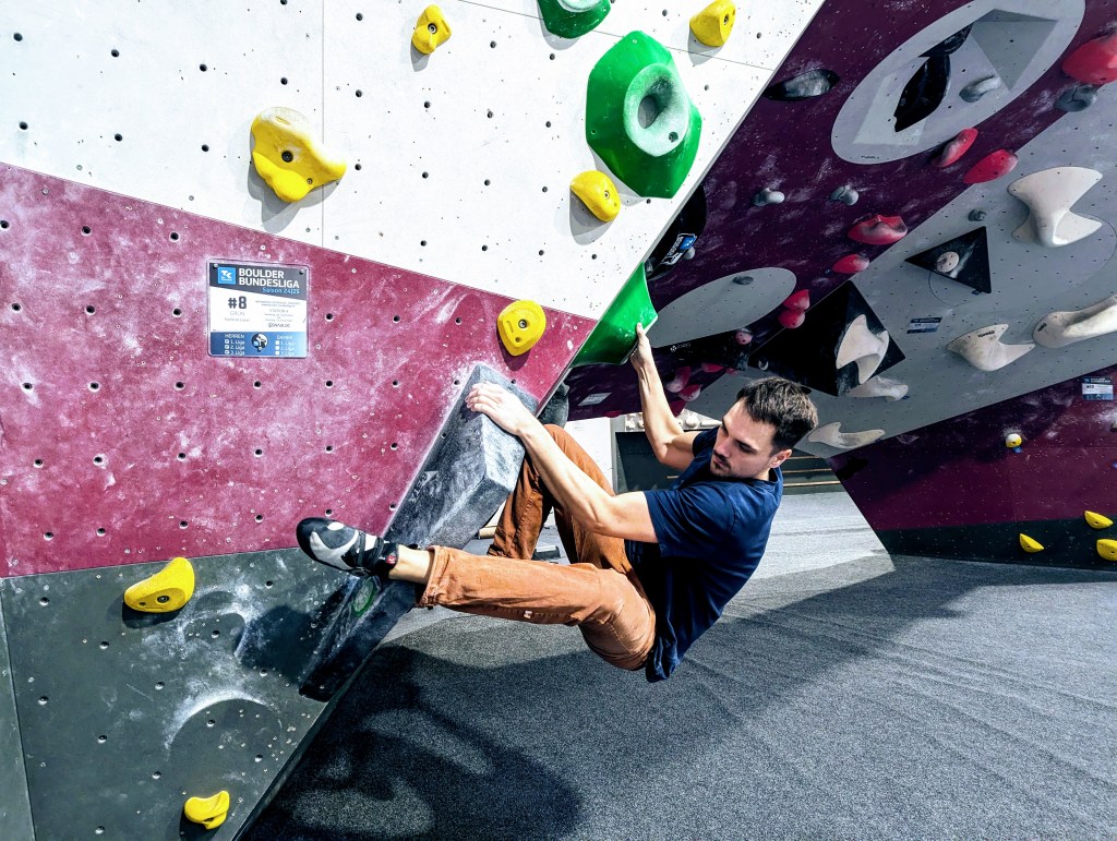 Während Niels mit Stephan den Wettkampf bestritt, statteten Mats und Kate der Zenit Boulderhalle Osnabrück einen Besuch ab; was für eine geniale Boulderhalle! Das Zenit hatte sich über die Jahre Stück für Stück um immer mehr Hallenfläche vergrößert, sodass hier die Besucher ein ganz eigener Charme erwartet – und natürlich ordentlich Boulderfläche. Von Bistro bis Boulderprobleme steckt hier ganz viel Liebe in der Halle. Es erwarteten uns noch Routen von einem Event, die einfach nur richtig viel Spaß machten und auch öfter angefasst werden wollten. Somit sind Niels und Stephan nach dem Wettkampf auch noch dazu gekommen und wir vier boulderten noch bis in den Abend hinein.