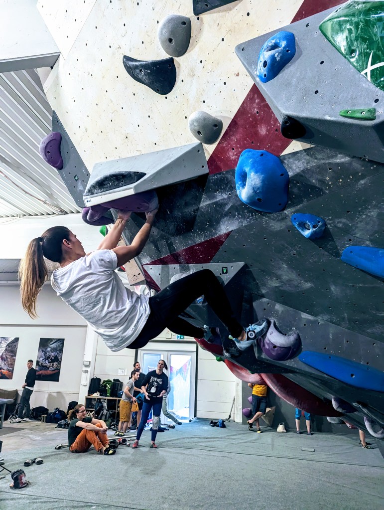 Das Wohnmobil bescherte uns trotz Eiseskälte eine erholsame Nacht und zudem konnten wir gleich am Samstagmorgen die Pforten des Block Barock durchschreiten. Und was sich uns da für ein Anblick bot! Ein sehr umfangreicher und einladender Bistrobereich brachte uns schon ins Staunen. Am liebsten hätten wir uns gleich zu Beginn für einen Kaffee in die Hollywood-Schaukel geschmissen. Aber später… erstmal wird gebouldert. Ob hinter diesem Bistro noch Platz für Boulderwände sind? Und ob – reichlich! Nach dem Durchschreiten der zweiten Pforte entdeckten wir einen beeindruckenden Boulderbereich, mit einem guten Mix aus offenen und verschachtelten Boulderwänden mit Boulderproblemen in allen Variationen. Trotz einer Woche nach Kickoff, war die Halle knackevoll mit vielen Boulder*innen der Liga. Wer es etwas ruhiger wollte, hielt sich in Richtung Trainingsbereich auf; aber die Boulderaction erreichte ihren Höhepunkt im hinteren Bereich. Zum ersten Mal schnupperten wir so richtig die großartige Stimmung der Boulder-Community der Liga. Es wurde angefeuert, unterstützt, beraten, diskutiert und zusammen an den Bouldern gefeiert. Das machte uns Lust, bei einem Kickoff dabei zu sein. Vielleicht klappt es ja in Mannheim ;-).